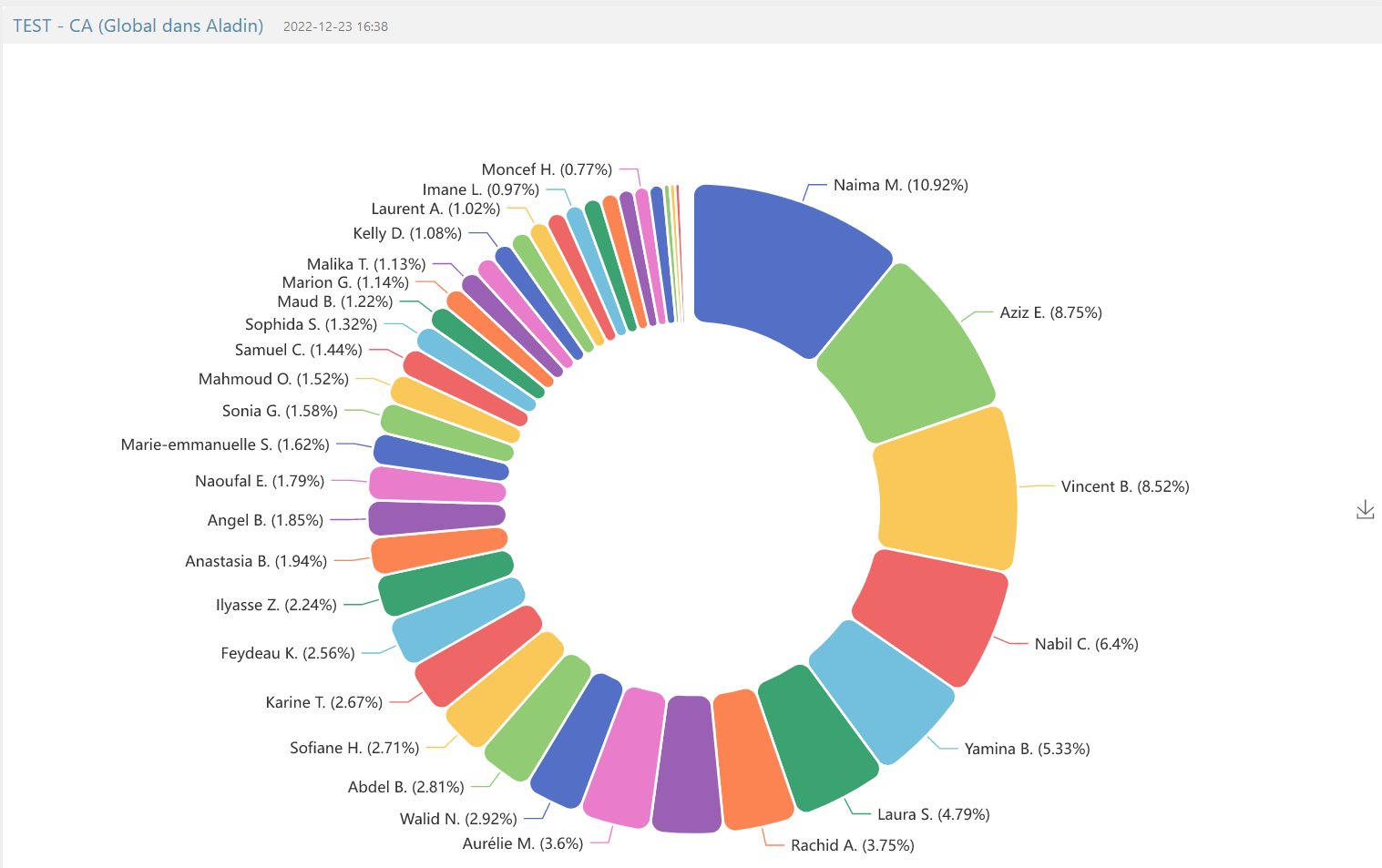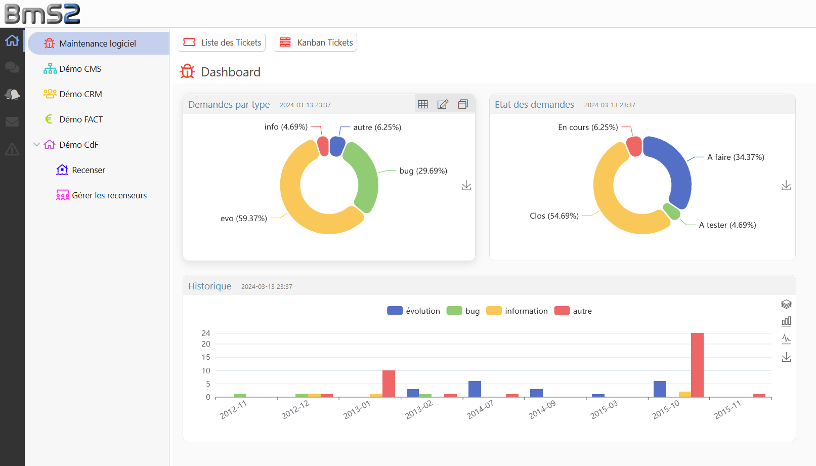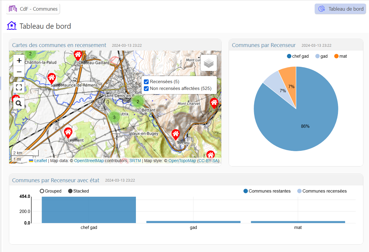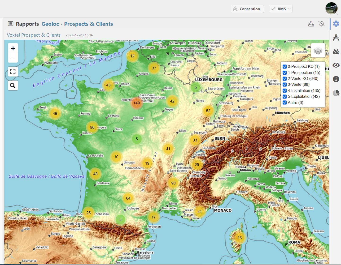 Le système permet de réaliser des tableaux de bord complexes personnalisables et paramétrables (graphes, tables, cartes etc....), des exports Excel complexes pouvant servir de dashboard ou l'utilisation d'outils externe (type Business Intelligence - BI) en donnant les droits d'accès à la base de BMS qui est construite sur votre organisation.